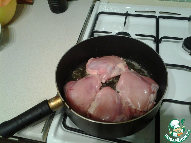 Опускаем в разогретое масло наши бедрышки и обжариваем на среднем огне 5 минут до золотистого цвета.