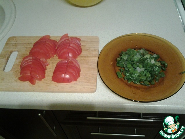 В это время режем помидорчики и сельдерей, у меня он черешковый замороженный.