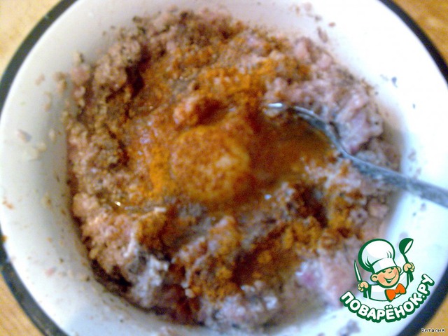 Соединить фарш мясной с грибным, добавить яйцо, соль, перец, приправу для курицы. Все тщательно перемешать.