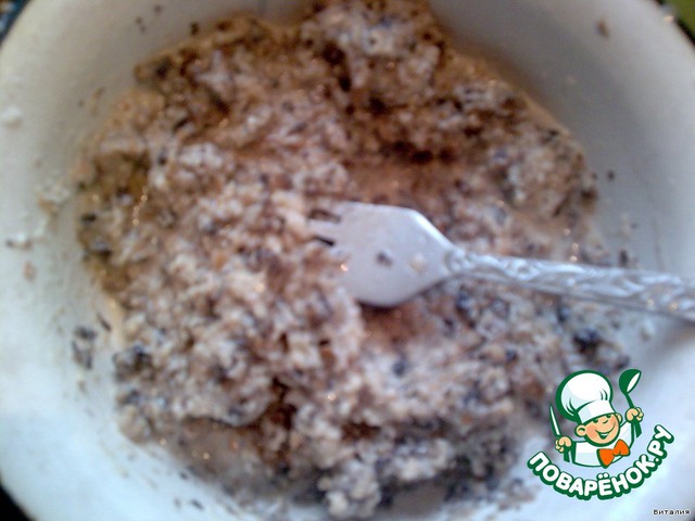 Остывшие грибы прокрутить через мясорубку, замочить в молоке булочку и тоже прокрутить с грибами, молоко влить в фарш.