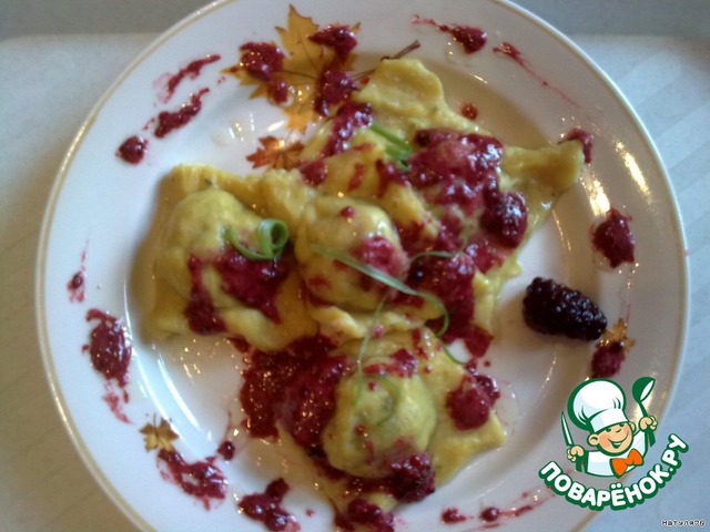 А пока равиоли варятся, можно приготовить соус. В сковороду влить вино, положить ягоды, добавить соль, перец и сливки. Когда все закипит, огонь уменьшить, ягоды размять и разбавить водой или бульоном до нужной консистенции. Сразу выключить