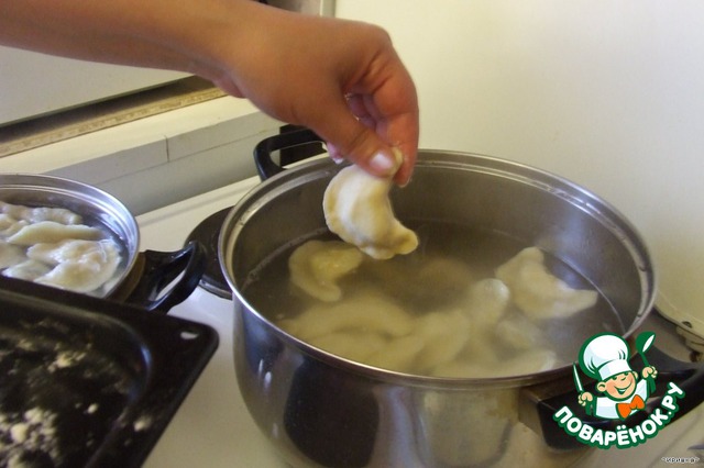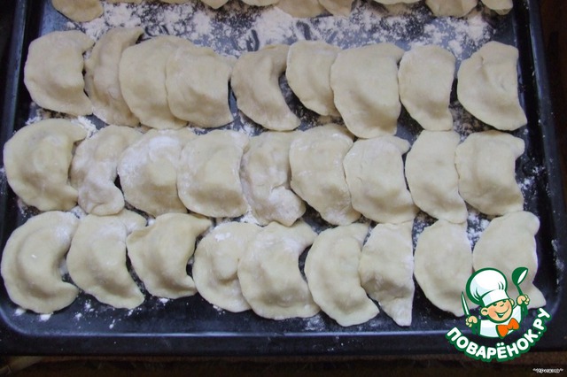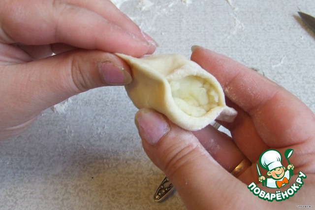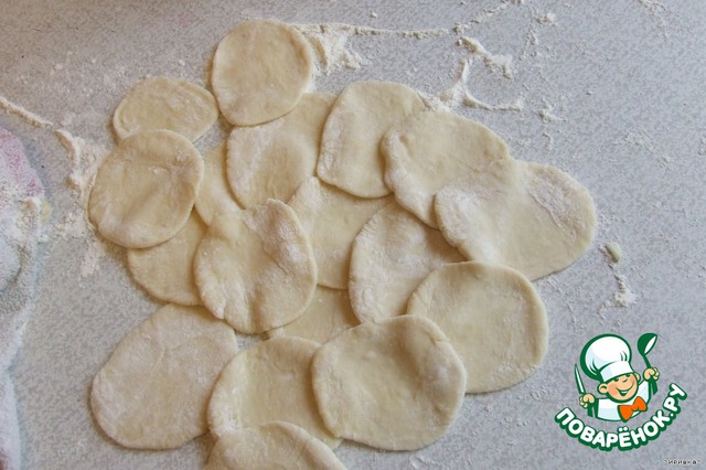 На каждый кружочек в серединку кладем начинку, сворачиваем пополам и защипляем края