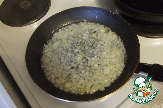 Режем репчатый лук и обжариваем на растительном масле до золотистого цвета