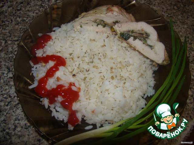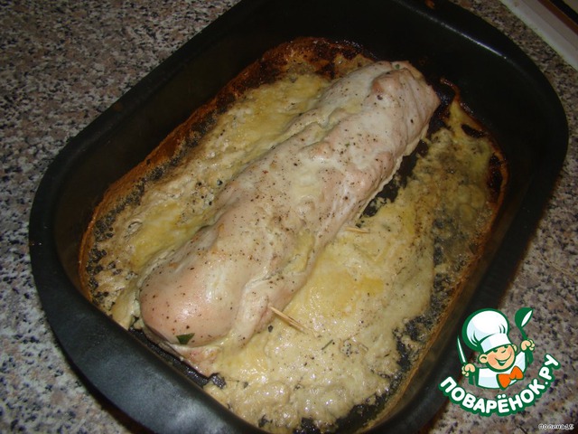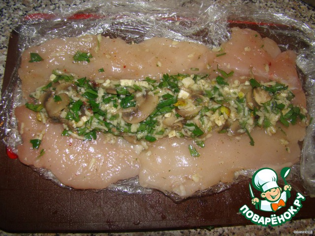Выложить начинку на курицу и аккуратно с помощью пленки завернуть в рулет