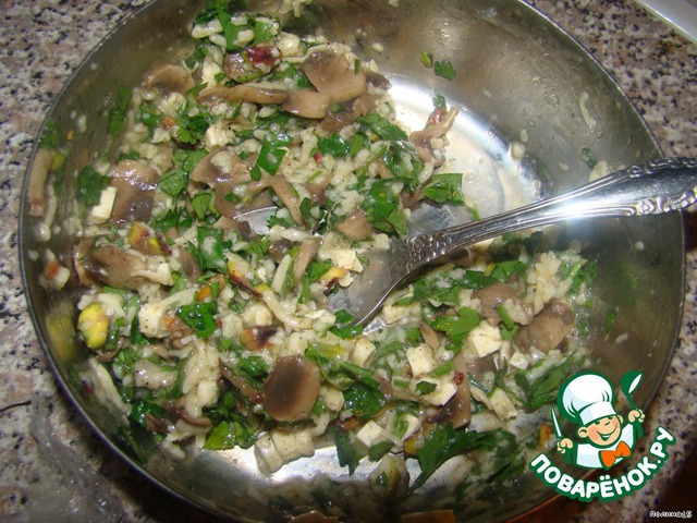 Делаем начинку. Обжарить нарезанные шампиньоны, дать немного остыть, натереть сыр, порубить петрушку, мелко нарезать брынзу, очистить фисташки и разрезать их по пополам.