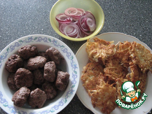 Положите готовые драники на тарелку, сверху положить колечко лука и котлетку.