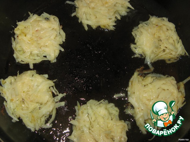Жарьте драники до золотистой корочки, выкладывая массу ложкой на сковороду с маслом.