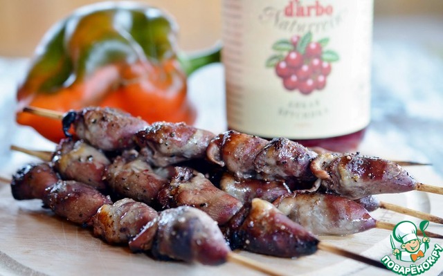 | Это блюдо, благодаря подаче на шпажках, очень нравится детям! А пряный сливочно-брусничный маринад придаёт сердечкам сочность и неповторимый аромат! |