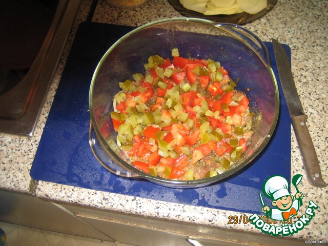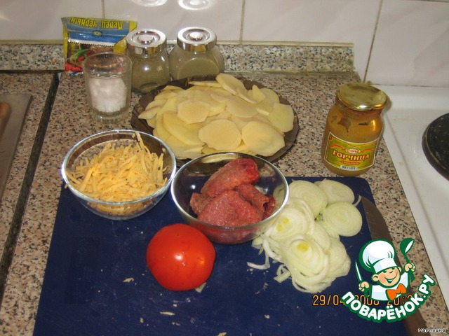 | Очень вкусное и легкое в приготовлении блюдо, которое мы делаем на праздники и в обычные дни. А когда звонят друзья и грозятся приехать через несколько часов - выручает!!! Не надо стоять у плиты: жарить, парить... , а просто закинула слоями продукты - и можно заняться собой, любимой. А родился у меня этот рецепт случайно, когда оказалось, что в холодильнике осталось всего понемногу, а хотелось вкусненького... |
