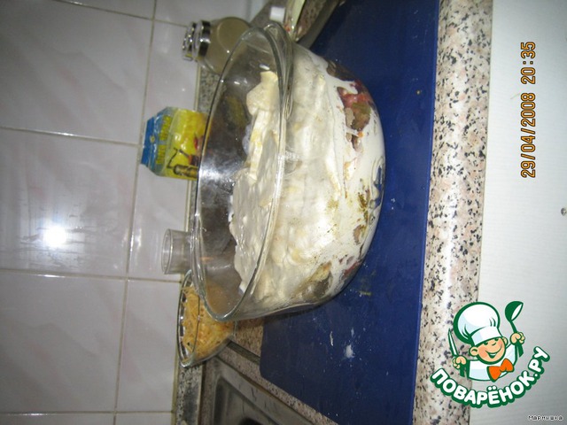 Залить соусом: майонез разбавить небольшим количеством воды. Поставить в разогретую духовку и выпекать под крышкой минут 40 - 50 (все зависит от духовки).