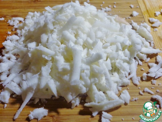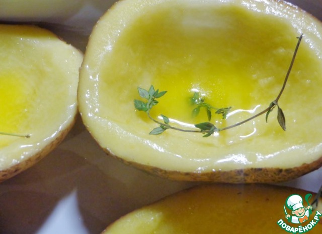 2 большие картошки хорошо вымыть, разрезать вдоль и выскоблить сердцевину (не выбрасывать, мелко нарезать).
