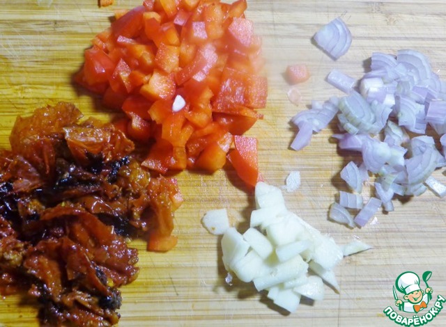 Лук, чеснок, вяленые томаты и сладкий перец нарезать.
