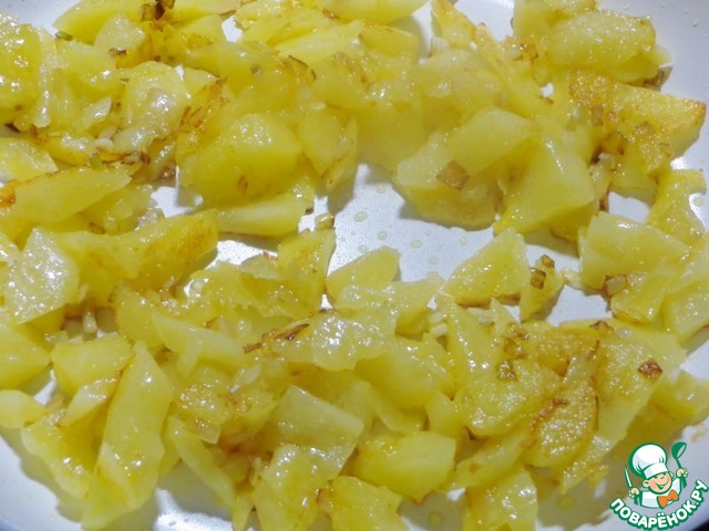 Обжарить лук с нарезанной сердцевиной картофеля.