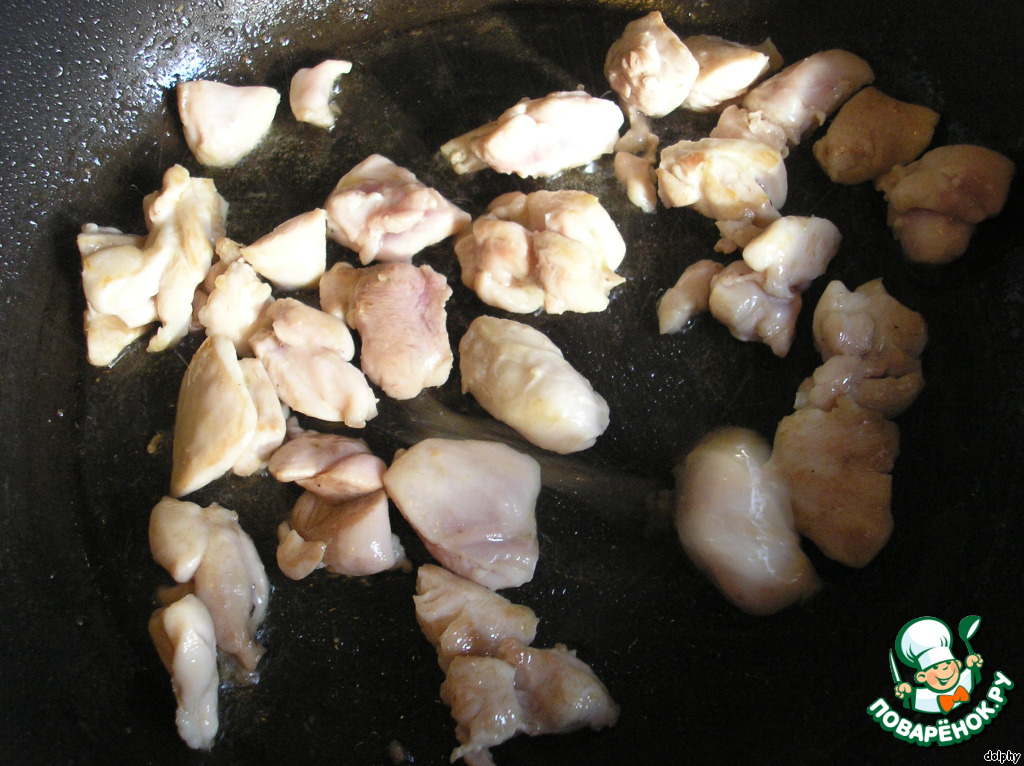 В сковороде нагрейте на большом огне 2 ст.л. оливкового масла, на дно насыпьте щепотку соли. Несколькими партиями обжаривайте на сковороде курицу с двух сторон 1-2 мин. После каждой партии добавляйте на сковороду немного соли и, если надо, оливкового масла. Имейте в виду, что курицу не надо прожаривать до готовности, а только слегка обжарить. Готовую курицу переложите в миску и отставьте.