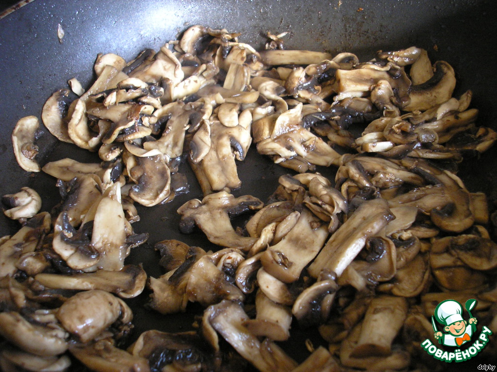 Увеличьте огонь, на сковороду положите шампиньоны. Поджарьте их без добавления масла, чтобы они слегка подрумянились и отдали лишнюю жидкость.