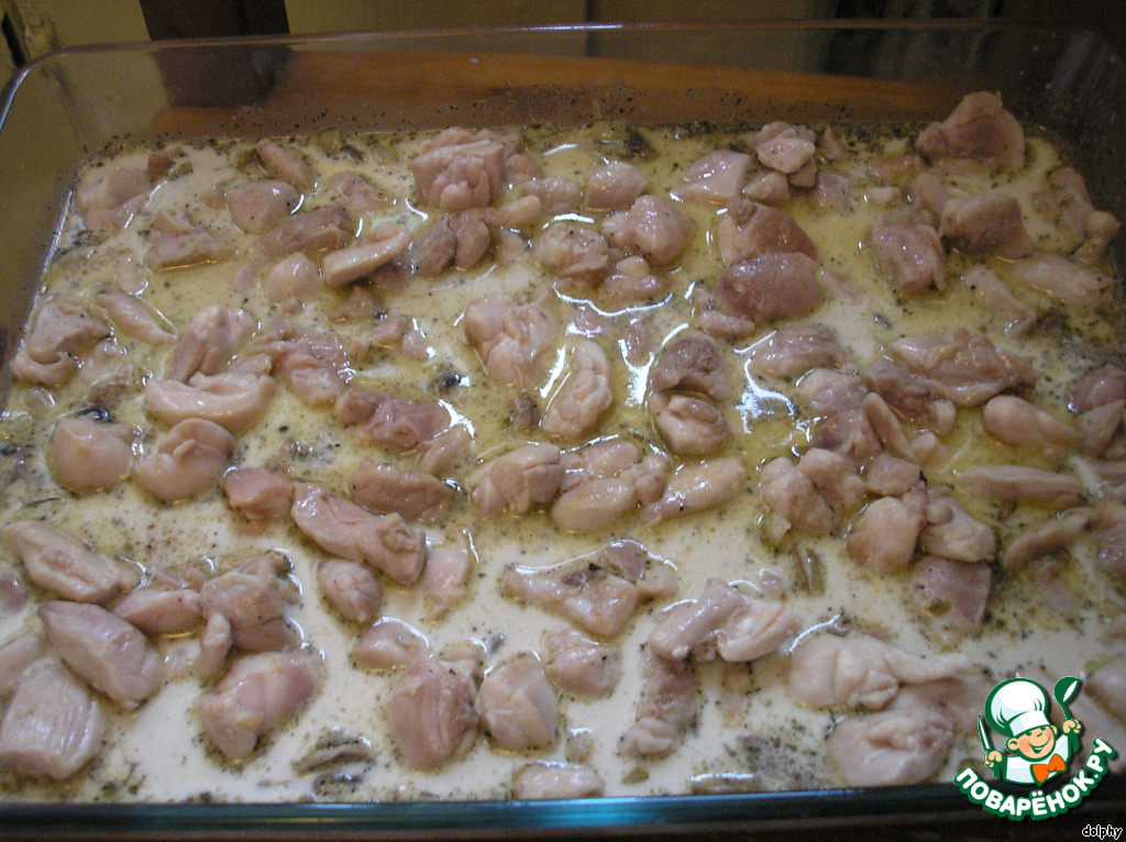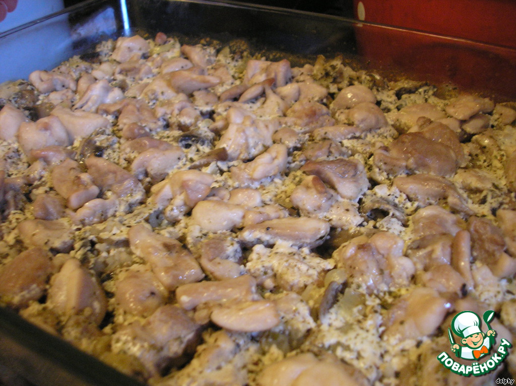 Сверху в один слой выложите кусочки курицы.