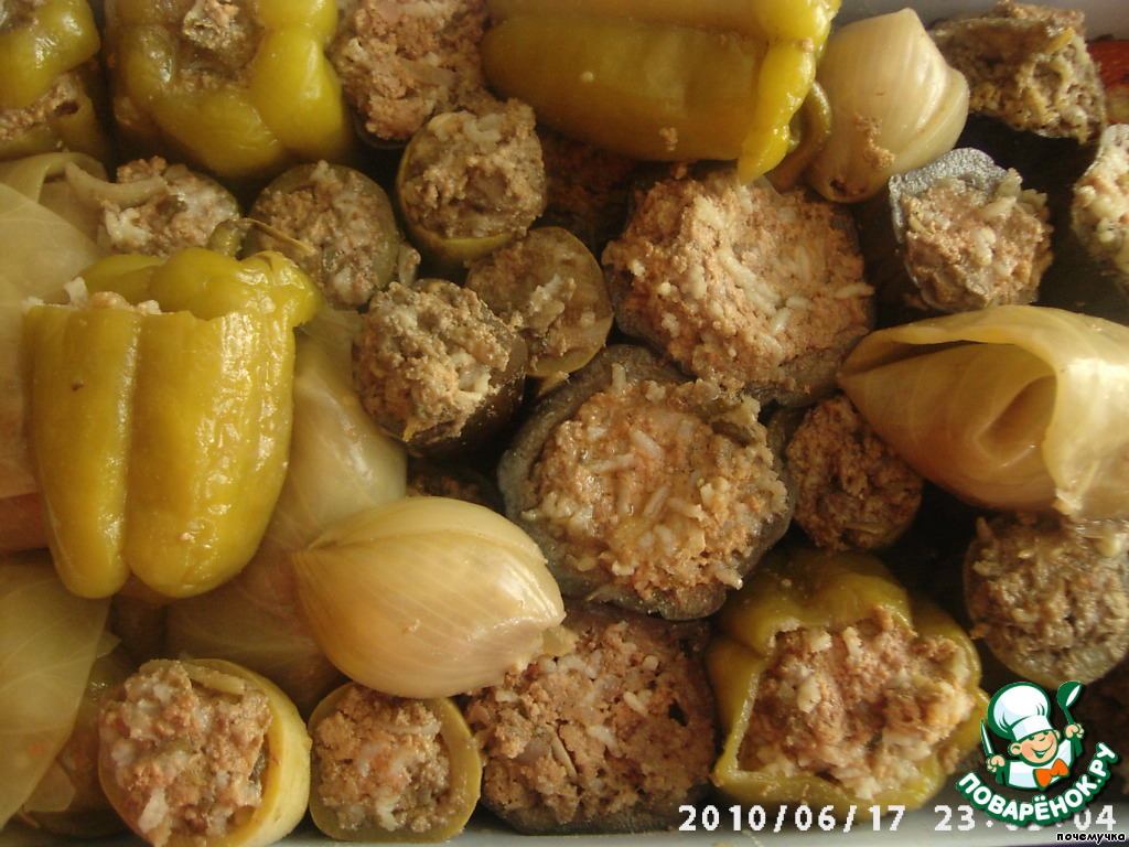 Наполнить фаршем овощи и выкладывать слоями в чугун. Тушить до готовности на среднем огне.