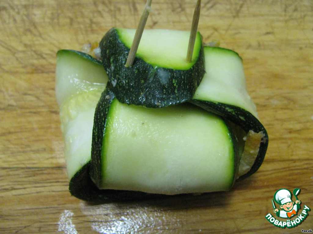 4. Из цуккини, положив ломтики крест-накрест, и начинки сформовать "сверточки", как на фото. А дальше по желанию - можно обжарить на сковороде, затем потушить под крышкой. Я люблю запекать в духовке при температуре 180 градусов на режиме гриль, слегка посыпав тертым сыром.