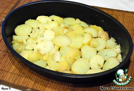 Форму смазать маслом. Картофель очистить, порезать на кружки и выложить одним слоем на дно формы.
