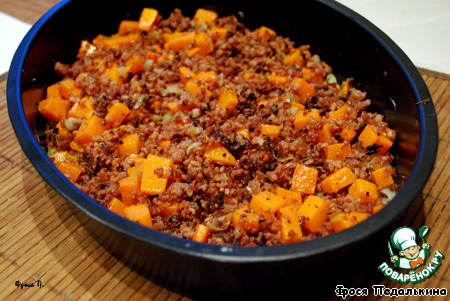 Фарш обжарить в сливочном масле 5-7 минут. Тыкву очистить от семян и кожуры, 1/3 отложить, остальное порезать кубиками и добавить к фаршу. Обжаривать, пока тыква не станет мягкой.