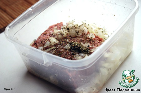 Фарш разморозить. Лук мелко порезать, смешать с фаршем, посолить, поперчить, добавить орегано.