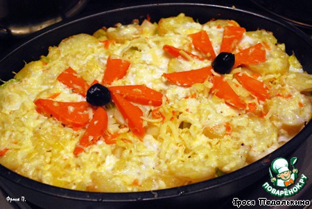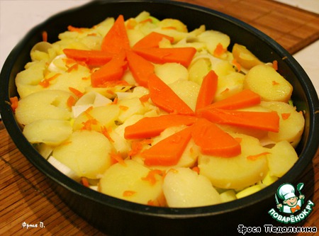 Закончить слоем картофеля. Отложенную тыкву порезать на треугольники и отварить до готовности. Я делала в СВЧ примерно 5 минут (мощность 750 Вт). Из треугольников выложить цветы. Сверху можно посыпать тертой тыквой, если осталась.