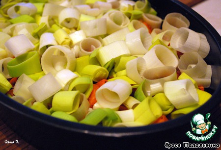 Белую часть лука-порея порезать на кольца шириной 1 см, разобрать на более мелкие колечки.