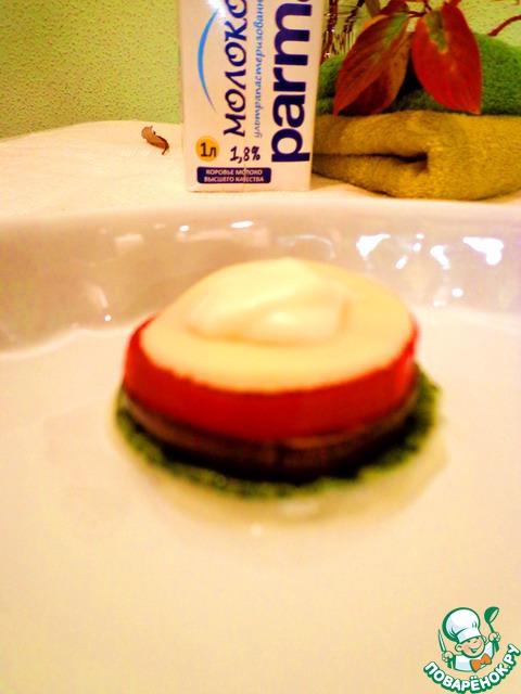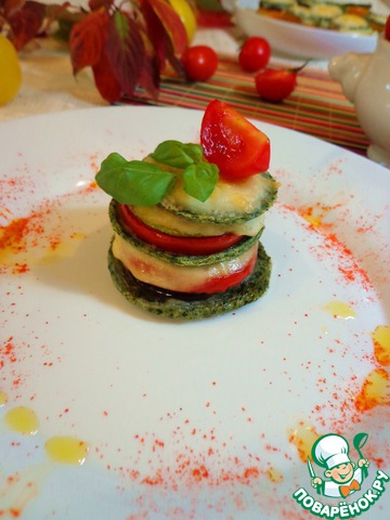 Нашу пизанскую башню установить на тарелку, украсить четвертинкой помидора черри и веточкой базилика. Тарелку сбрызнуть оливковым маслом и присыпать паприкой.
