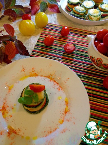 Собираем наши башенки. На дно формы выкладываем 1 ч. л. соуса, кругляшок лазаньи, немного соуса, баклажан, помидор, моцареллу, соус. И повторяем то же самое, только вместо баклажана кабачок.
