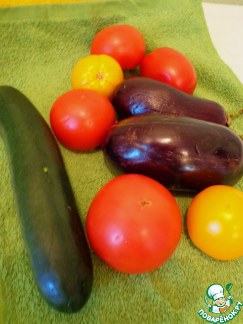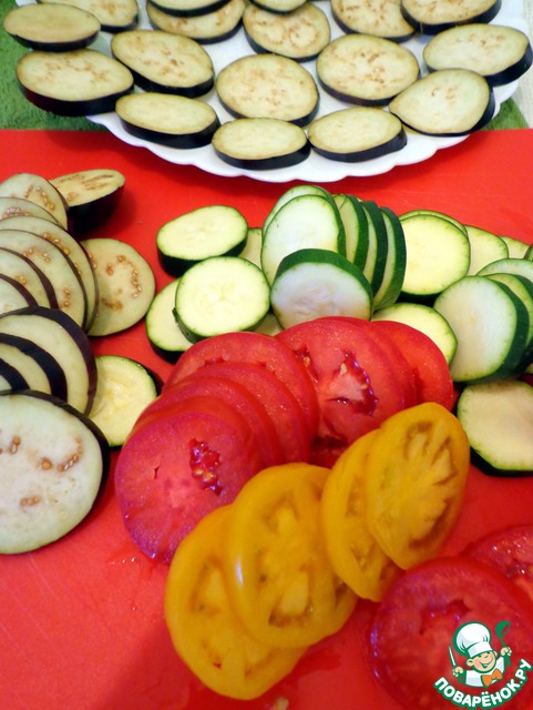 Всё нарезаем кружочками. Баклажаны немного (!) посолить и оставить минут на 20-30. Когда из них выделится сок, обсушить бумажным полотенцем.