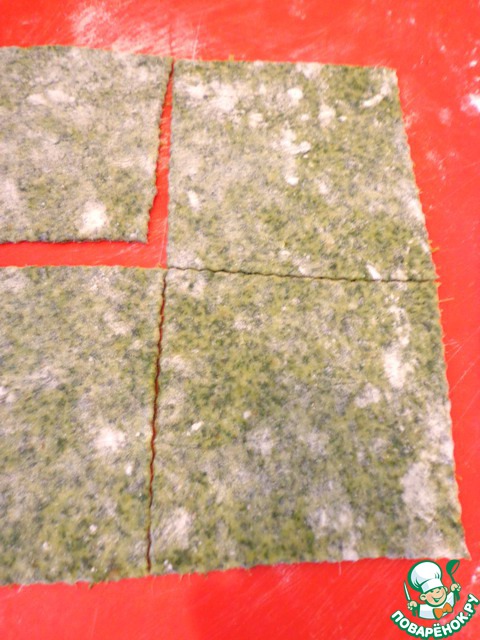 Тесто разделить на 4 части, каждую часть раскатать в тонкий пласт. Нарезать на квадраты 10х10 см. У меня в форму для запекания как раз помещается 4 таких квадрата.