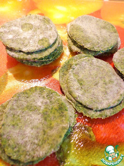 Также вырезаем кружочки, диаметром примерно совпадающие с нашими овощами.