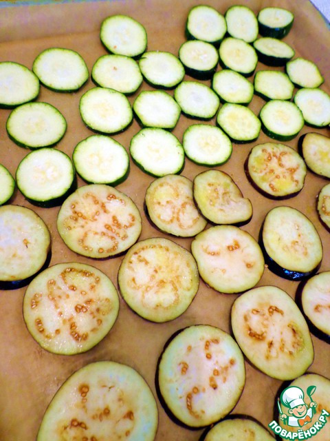 Баклажаны и кабачки выложить на противень, смазать оливковым маслом и запечь в духовке. Примерно минут 10 при температуре 180 градусов, до готовности. Или можно обжарить на сковородке.