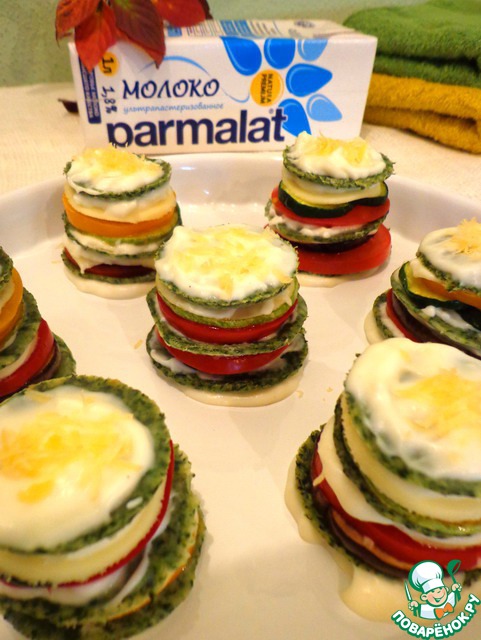 Башенки ставим в духовку при 180 градусах на 7 -10 минут. Они так и норовят упасть, конечно, но при правильном "построении" из духовки они выйдут слегка наклонёнными и только )