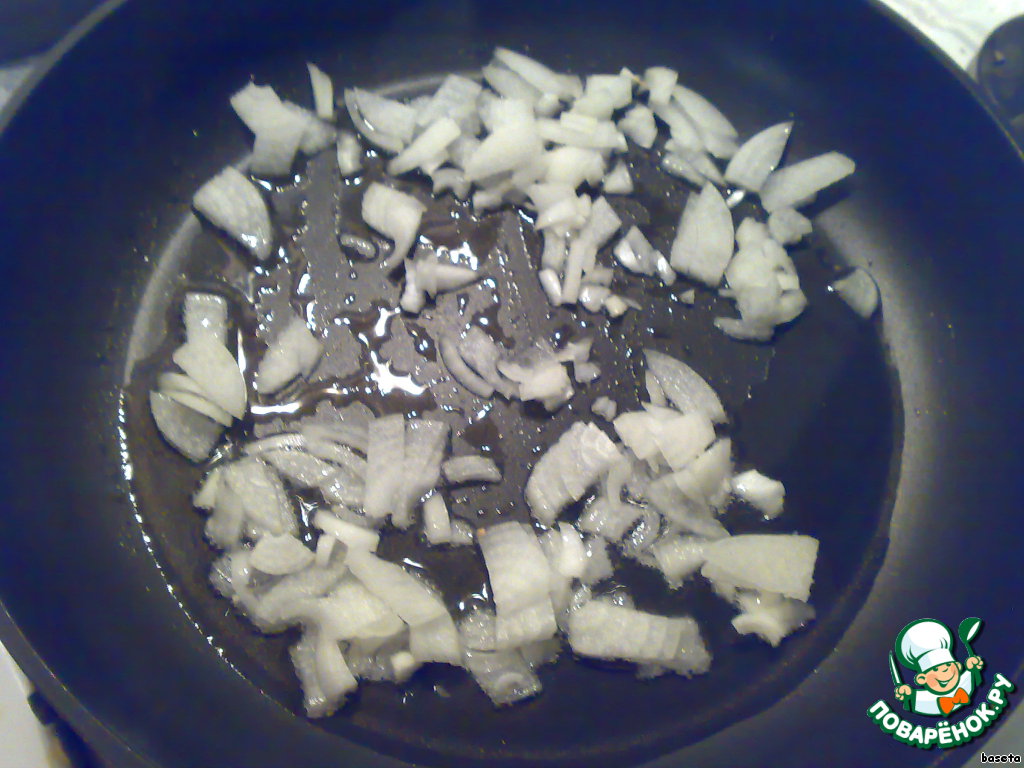 Мелко порезанный лук обжариваем на масле до золотистого цвета.
