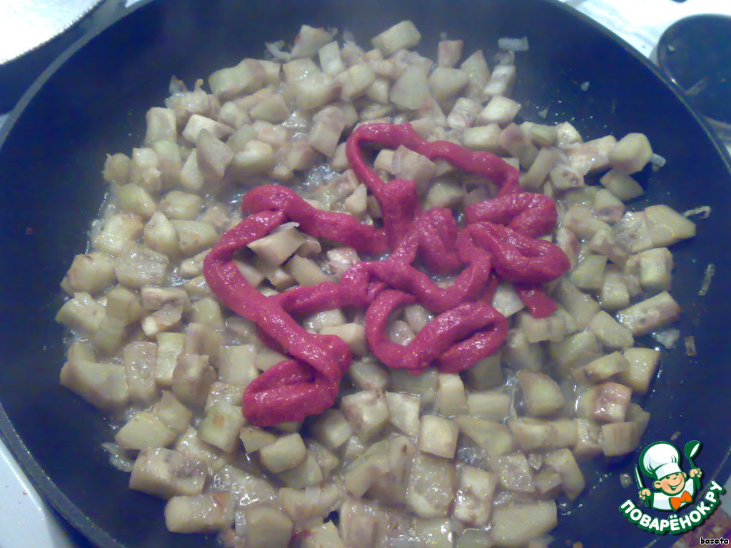 Когда баклажаны будут почти готовы, добавим к ним томатную пасту или кетчуп. Если используете томатную пасту, то ее нужно разбавить водой, иначе соус будет очень густой.