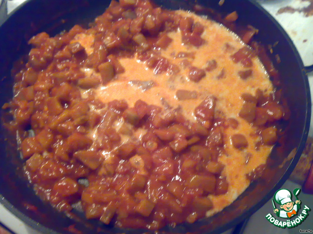 Когда наш соус закипит, добавим молоко и тушим до готовности баклажанчиков.