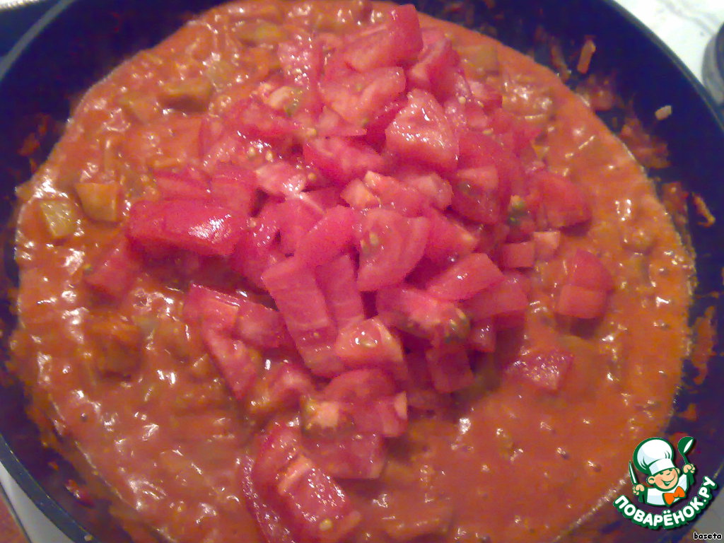 Как только все будет готово добавим порезанные помидоры. Помидоры предварительно нужно очистить от кожуры, ошпарив их кипятком. После добавления помидорчиков минут через 5 отключаем огонь и наше блюдо готово!!!!