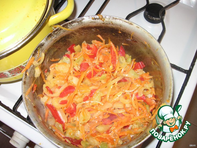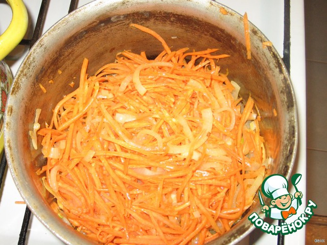 Добавляем морковь и тоже обжариваем, потом чуть-чуть притушиваем