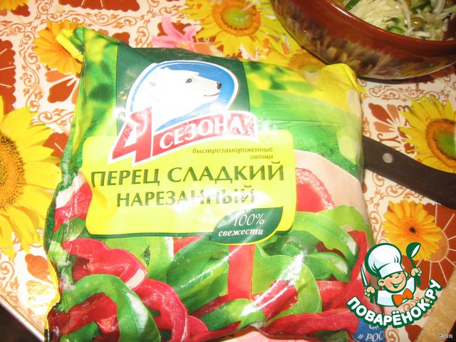Перец болгарский (у меня замороженный), если свежий, то 2-3 крупные штучки нарезать соломкой