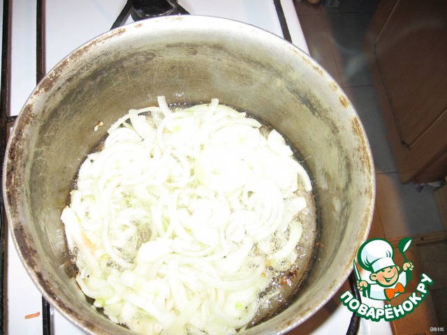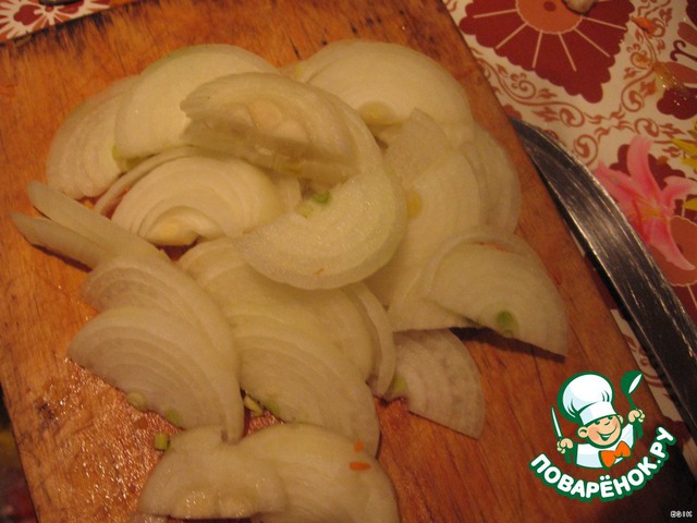 Лук режем тонкими полукольцами