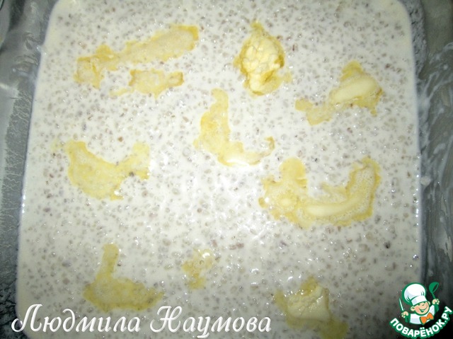 Кашу разровнять, положить тоненькие кусочки масла (или можно предварительно растопить его и сбрызнуть кашу), поставить в разогретую при 175 градусах духовку и запекать 7 минут.