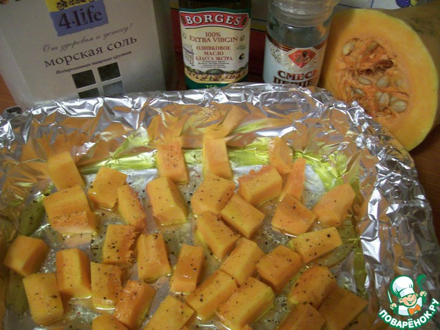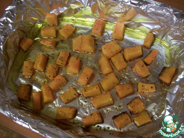 Нарезать тыкву на небольшие ломтики, выложить в противень, полить четырьмя столовыми ложками масла, посолить, поперчить и поставить в разогретую до 200 градусов духовку на 15 минут.