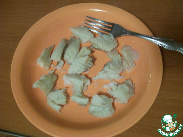 В это же время отвариваем филе рыбы (15 минут), затем аккуратно разделяем на кусочки.