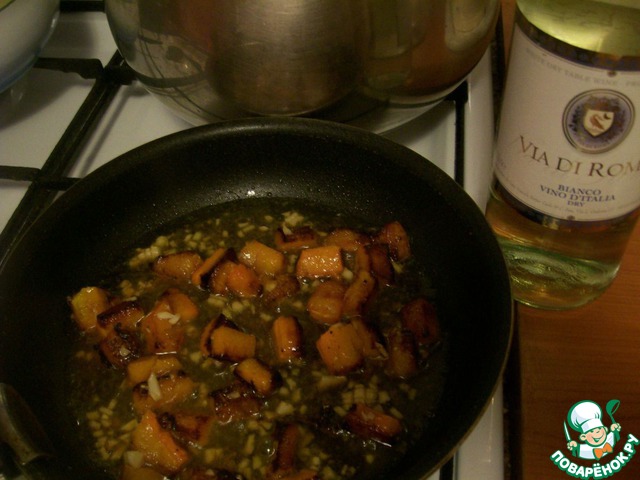 И сразу вливаем белое сухое вино, наполовину выпариваем.