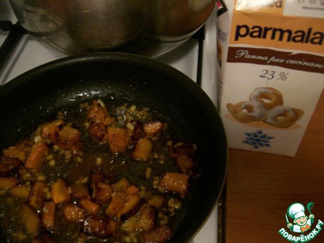 Пока запекается тыква, необходимо отварить пенне до состояния аль денте. Также нужно мелко нарезать чеснок.