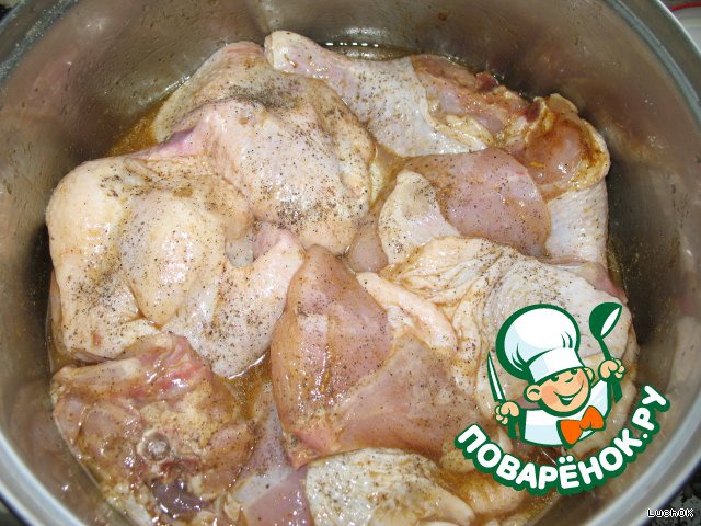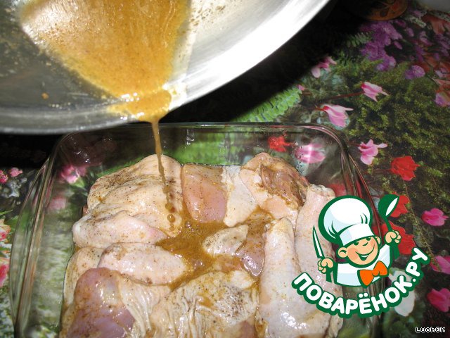 Вкладываем в неё куски курицы (смазывать форму не нужно, т.к. курица и так у нас уже в масле), и поливаем сверху оставшимся маринадом из кастрюли.