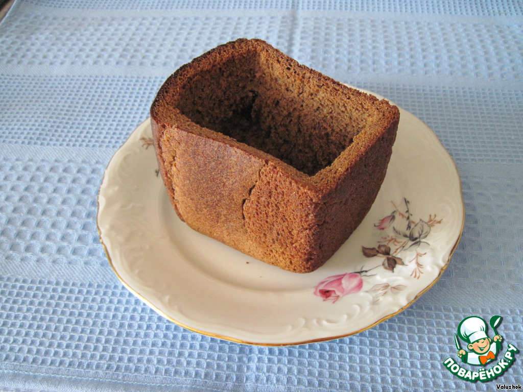 Удалите мякиш вилкой, оставив стенки толщиной 0,5 см, а дно 1 см, и подсушите в жаркой духовке при температуре 180 град. около получаса, чтобы стенки уплотнились и хорошо зачерствели.