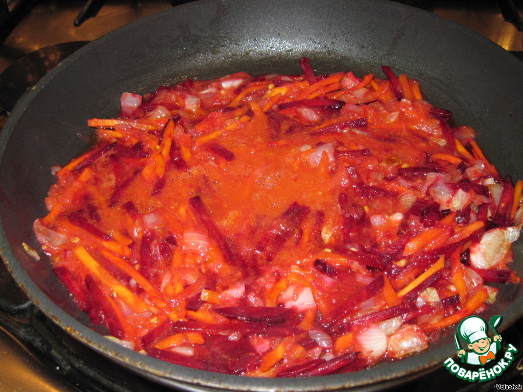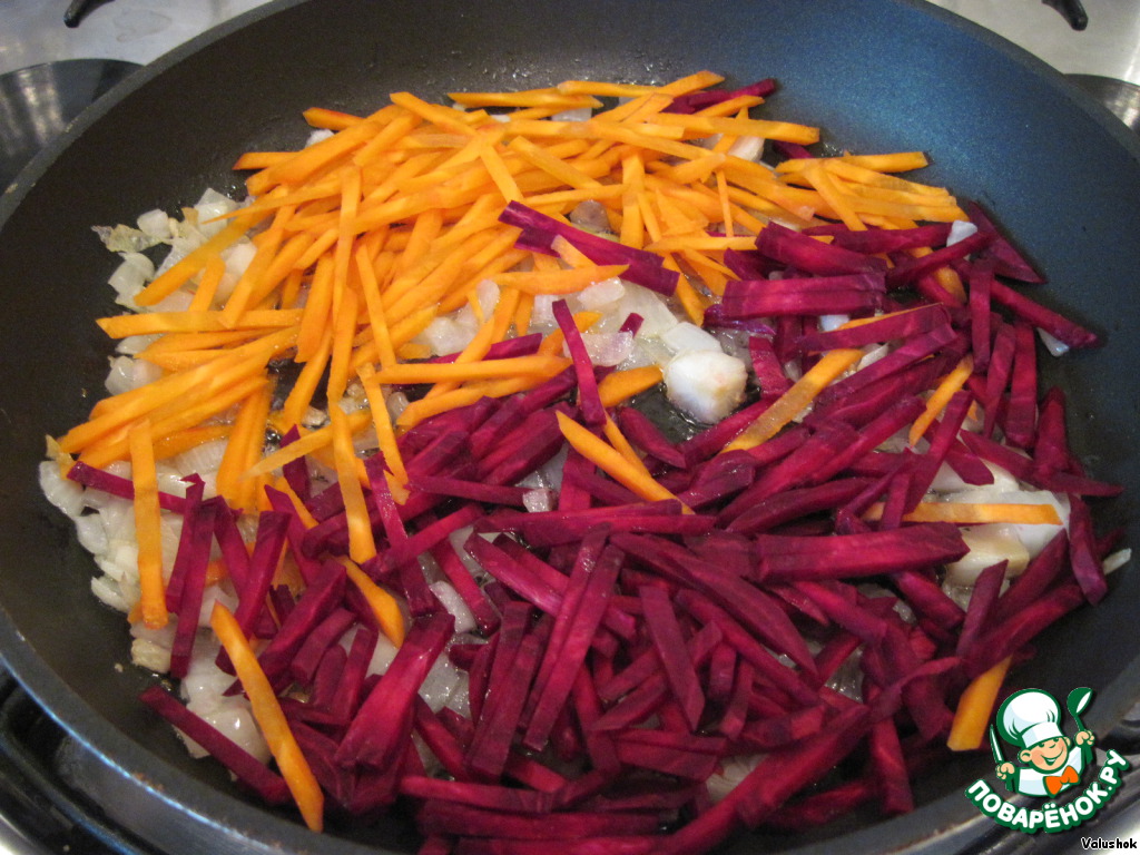 Обжарьте слегка лук, затем добавьте морковь и свеклу, продолжая процесс обжаривания еще минут 5, в самом конце добавьте чеснок.