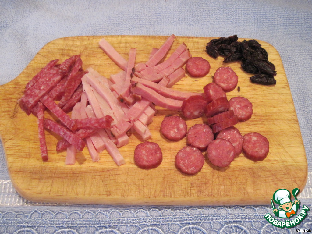 Нарежьте мясное ассорти из всего, чего Ваша душа пожелает - охотничьих сосисок, салями, ветчины, буженины и. т. д. Измельчите предварительно распаренный чернослив.